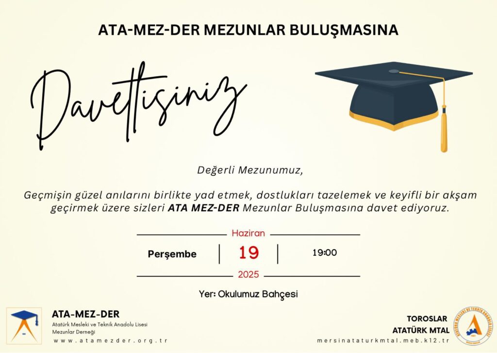 Nazik davetleri ve samimi ev sahiplikleri için ATA-MEZ-DER yöneticilerine, Toroslar Atatürk Mesleki ve Teknik Anadolu Lisesi Okul Müdürümüz Sayın Ömer Yiğit’e, Dernek Kurucu Üyelerinden Hatice Kurt’a ve Elektronik Bölüm Başkanı Sayın Arif Toker’e teşekkür eder, saygılarımızı sunarız.